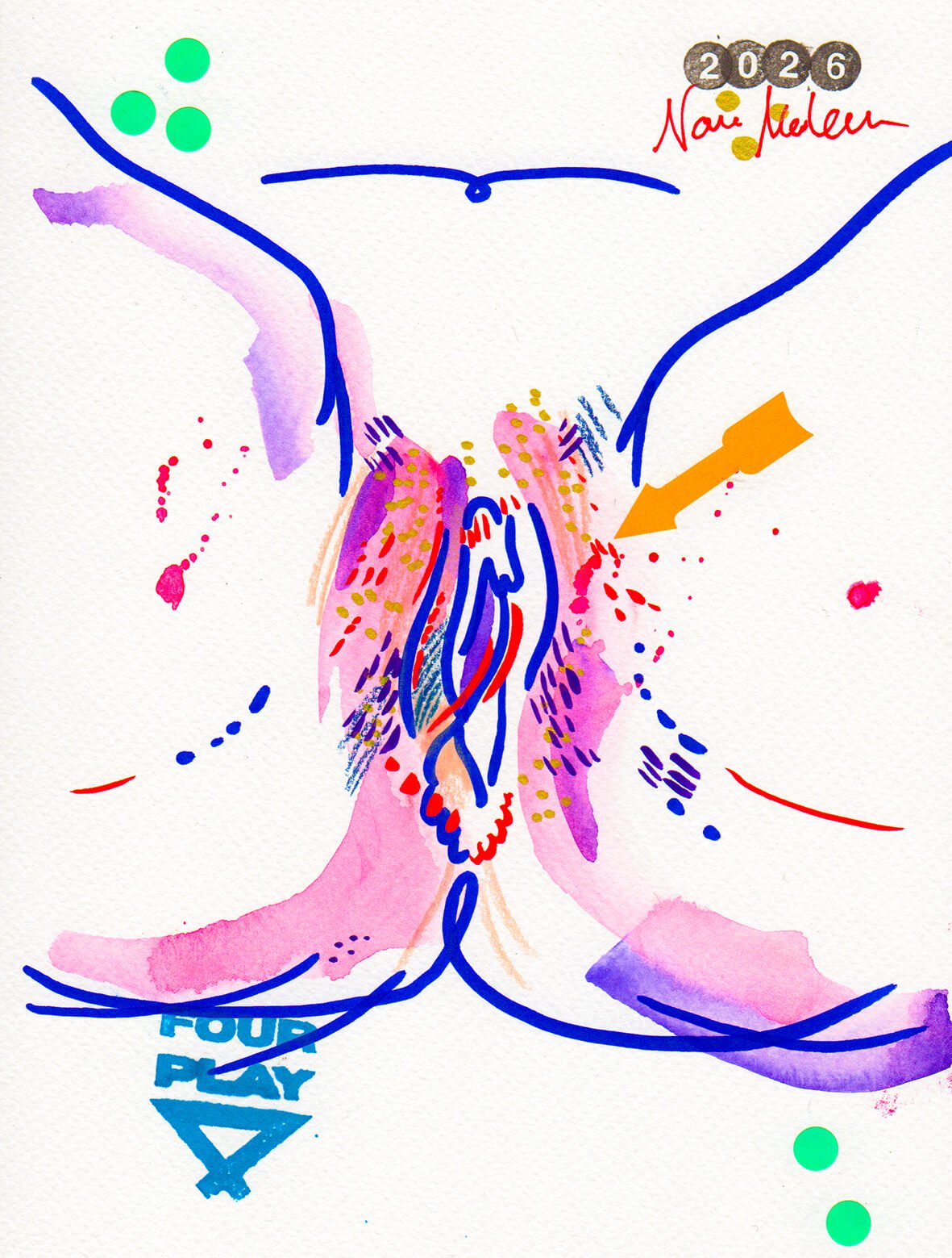 A handmade portrait of your vulva — drawn from photo reference, in mixed media: coloured pencil, felt-tip and watercolour.